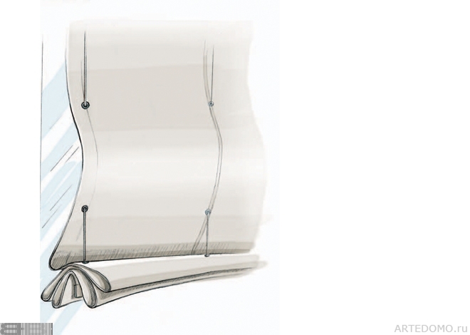 Такая штора с маленькими люверсами, в которые продернуты шнуры, не лишена очарования. Складки формируются внизу шторы и хорошо натягивают ее.
