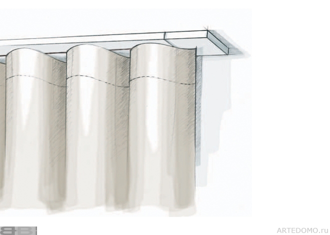 Создайте неброскую стену мягких умных волн из ткани, благодаря специальному современному карнизу, который крепиться на потолок. Эта простая волнистая поверхность декорирует комнату от стены до стены.