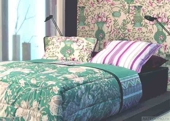 Орнамент ткани складывается из побегов цветущих деревьев, клеток для птиц и японских ваз с тюльпанами. Рисунок создан по мотивам японской книжной иллюстрации XVIII века.