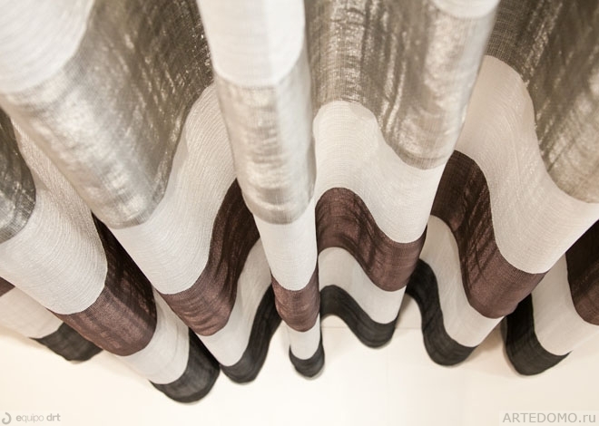 Тонкая, двойная органза, в центре - полосатая сетка. Дизайн состоит из широких полос, местами ткани сплетаются вместе и создают одну, единую, ткань. На участках, где ткани не сотканы воедино, создается мерцающий эффект.