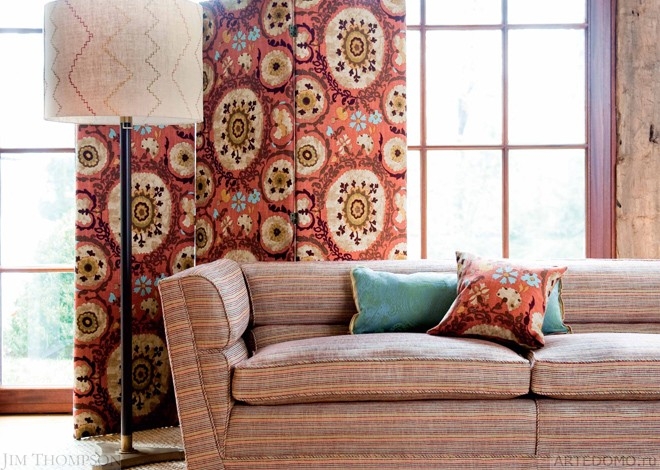 Узор из ярких кругов на фоне плотной текстурированной, а потому обладающей повышенной износостойкостью ткани вызывает ассоциации с ремесленными производствами Центральной Азии. PHULKARI будет смотреться одинаково великолепно как в качестве обивочного материала для мебели, так и в качестве основы для ярких, цветных штор.