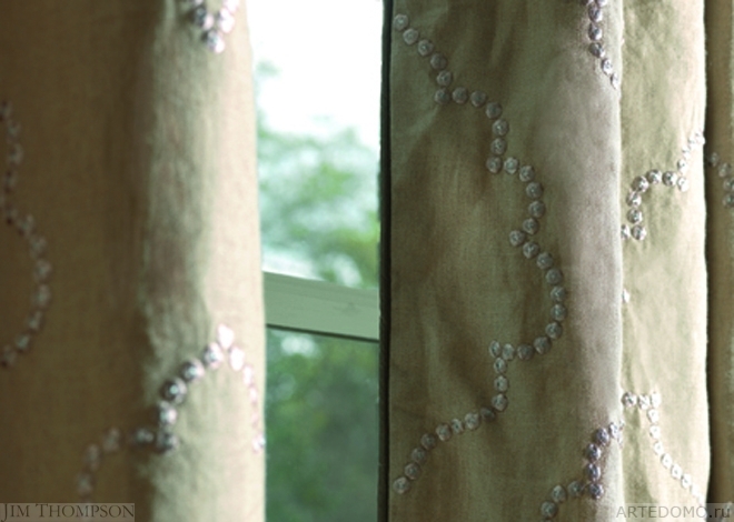 Эта восхитительная вышивка по льну вдохновлена используемой в Индии техникой прикрепления к полотну маленьких зеркал или металлических предметов. Здесь зеркала заменяет серебряная металлическая нить, создающая эффект сверкающего на свету ювелирного украшения. Крупный мотив «медальон», вышитый из цепочек маленьких кружков, классически прост и придает этой ткани изощренность и долговечность.