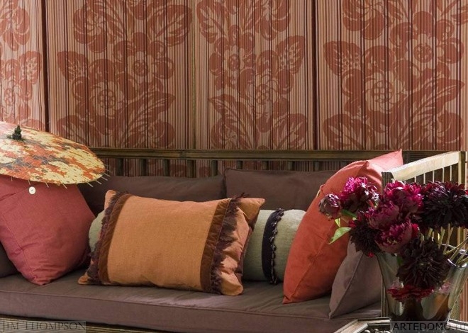 Поселившись в Бангкоке, Джим Томпсон буквально влюбился в шелк. Модель CANDY TWIST была инспирирована этой его страстью. Хлопковые и шелковые нити дают ткани два прекрасных свойства: хлопок делает ее прочной, а шелк прибавляет блеска и мягкости. Фоновый рисунок состоит из чередования тонких полосок. Поверх них напечатаны крупные цветы и листья. Комбинация масштабного изображения и мелких полос создает эффект голографии: когда полотно свисает складками, рисунок кажется объемным.