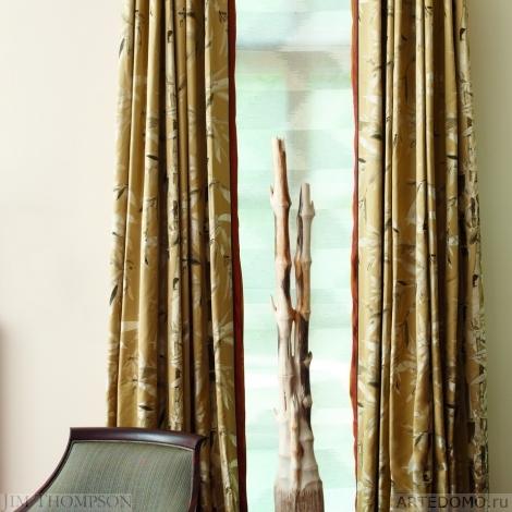 Для этой основной ткани нашей новой коллекции мы создали усовершенствованный шелковый жаккард с изысканным бамбуковым узором. Бамбук в китайском искусстве является традиционным благоприятным символом долголетия и способности быстро восстанавливать свои силы. Наш экзотический бамбуковый дизайн был навеян ручной росписью чернилами в китайских свитках. Величие масштаба и выбор цветов намекает на гламур 1970-х годов, придавая ткани более живой и романтичный вид. Столь интригующим этот жаккард делает его многоцветность и использование в нем тонких нитей шелка, создающих легкие оттенки и тона.