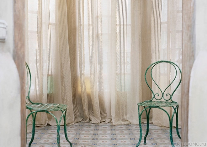 Тюль с тонкими прозрачными полосами на фоне плотного льняного переплетения смотрится очень естественно.