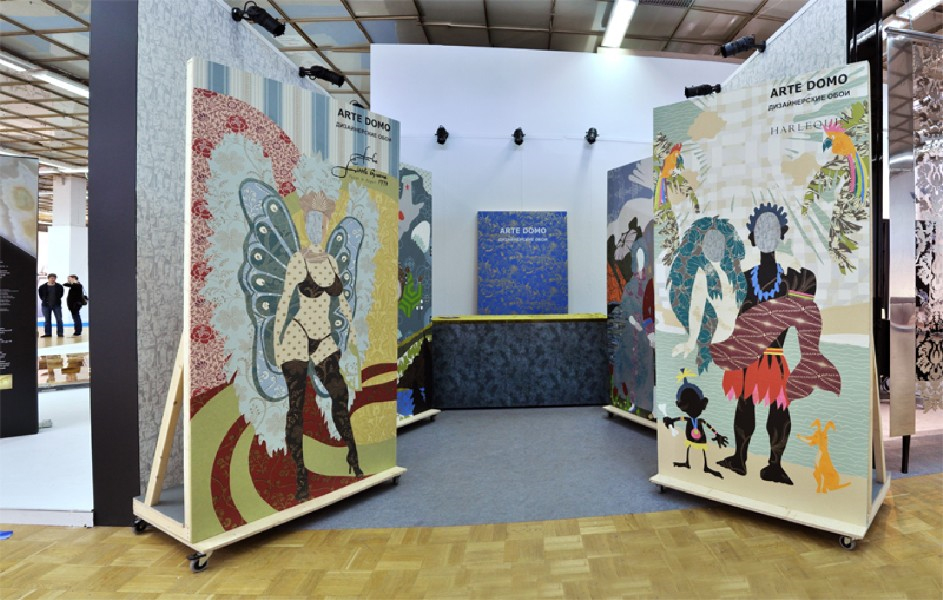 Вместо пафосных вывесок и неоновой рекламы ARTE DOMO установил по периметру небольшого по размерам стенда тантамарески – картины с отверстием для головы, знакомые всем российским курортникам. Веселые рисунки-аппликации были сделаны из обоев HARLEQUIN, LITTLE GREENE, TRES TINTAS и Equipo DRT. «Примерь обои!» – таков был девиз всего проекта.