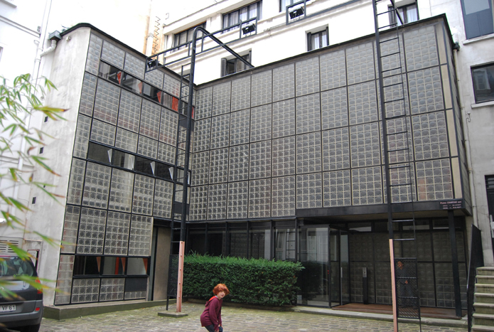 Дом задумывался как машина для жилья. В нем не было привычного деления на комнаты и коридоры, но присутствовало жесткое зонирование. Первый этаж отводился под рабочий кабинет и приемную хозяина – Жана Дальзаса (Jean Dalsace), известного врача-гинеколога. Второй состоял из просторной living room, будуара хозяйки и комнаты отдыха хозяина, третий включал спальни членов семьи, а так же комнату прислуги. Все людские потоки были разведены: прислуга не соприкасалась с хозяевами, клиенты – со всеми остальными. Основные строительные материалы – металл и стекло. Стены сложены из полупрозрачных стеклянных блоков, какими мостили полы в метро. Вредоносным микробам в этом доме не оставили шансов: аккумулятор пыли – интерьерный текстиль практически отсутствует, зато металлические ступени лестницы сделаны съемными: их можно не просто вымыть, но при необходимости продезинфицировать. Парадокс состоял в том, что уклад жизни в этой семье оставался традиционно буржуазным: жена со специального балкончика могла видеть, какие посетительницы идут к мужу. А супруг по скрипу двери (единственная скрипучая дверь в доме) мог понять, покинула ли жена свою половину.