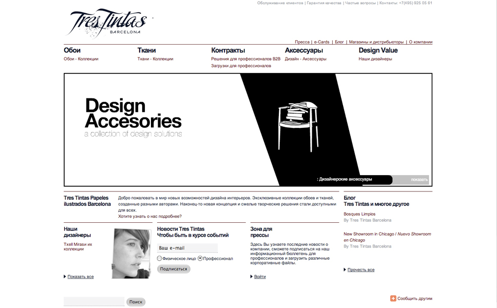 Сайт современен по стилистике, удобен в навигации и адресован широкому кругу посетителей – от просто любопытствующих, которые смогут заказать на нем десяток-другой рулонов, до профессионалов, желающих не только купить, но, например, разместить у Tres Tintas заказ на индивидуальные неповторимые обои и ткани.